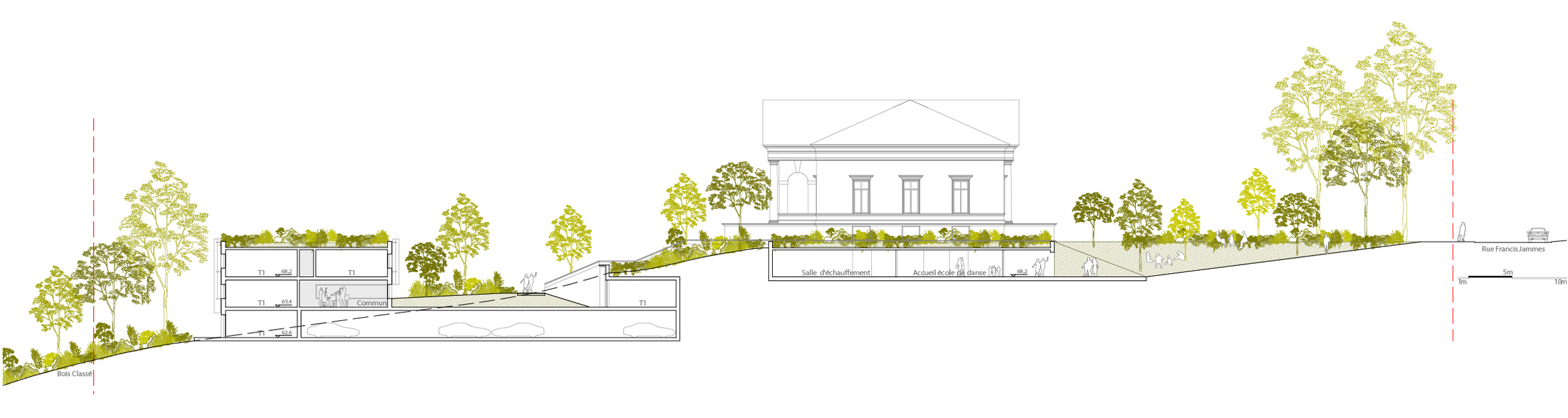 centre de danse (balets Oyhamburu), résidence étudiante de 160 lits et espaces communs associés, parking enterré paysager de 85 places
